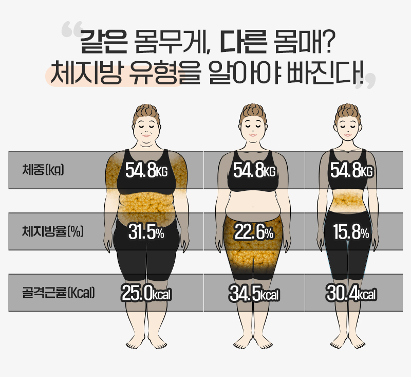 같은 몸무게여도 지방 분포도에 따라 몸의 체형이 달라질 수 있다. 다시 말하면 우리 몸에 근육량이나 체지방량은 얼마나 되는지, 어느 부위에 지방이 많이 분포되어 있는지를 아는 것이 다이어트의 핵심이라고 볼 수 있다.