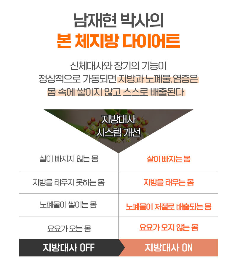 남재현 박사가 직접 배합한 본 체지방 다이어트는 지방 대사 시스템을 개선시키기 위해 지방 대사 스위치를 ON시켜 대사 기능이 활성화 되도록 도와 몸속 가득한 염증, 찌꺼기들을 한번에 공략해 배출해낸다. 또한 탄수화물과 당 섭취 후 지방이 몸속으로 합성되는 것을 차단하고 근본적인 비만체질을 개선하여 감량한 체중을 꾸준히 유지할 수 있다.